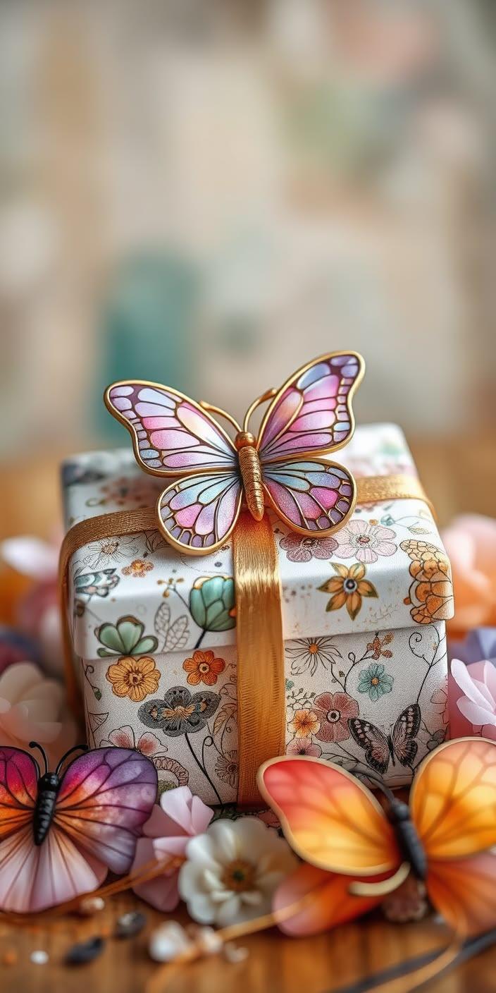 A whimsical gift box adorned with colorful butterflies, floral patterns, and golden ribbon creates delicate wallpaper.