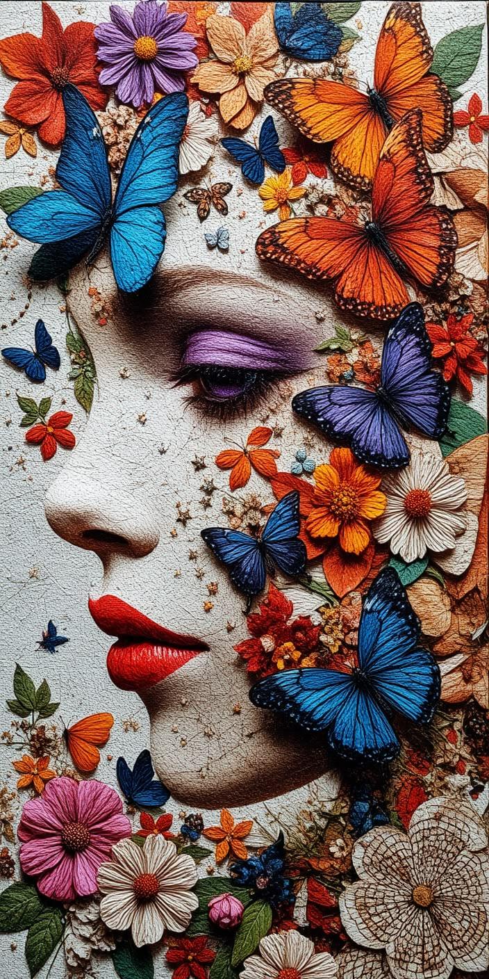 Colorful woman's profile adorned with vibrant butterflies and flowers against textured white background wallpaper.