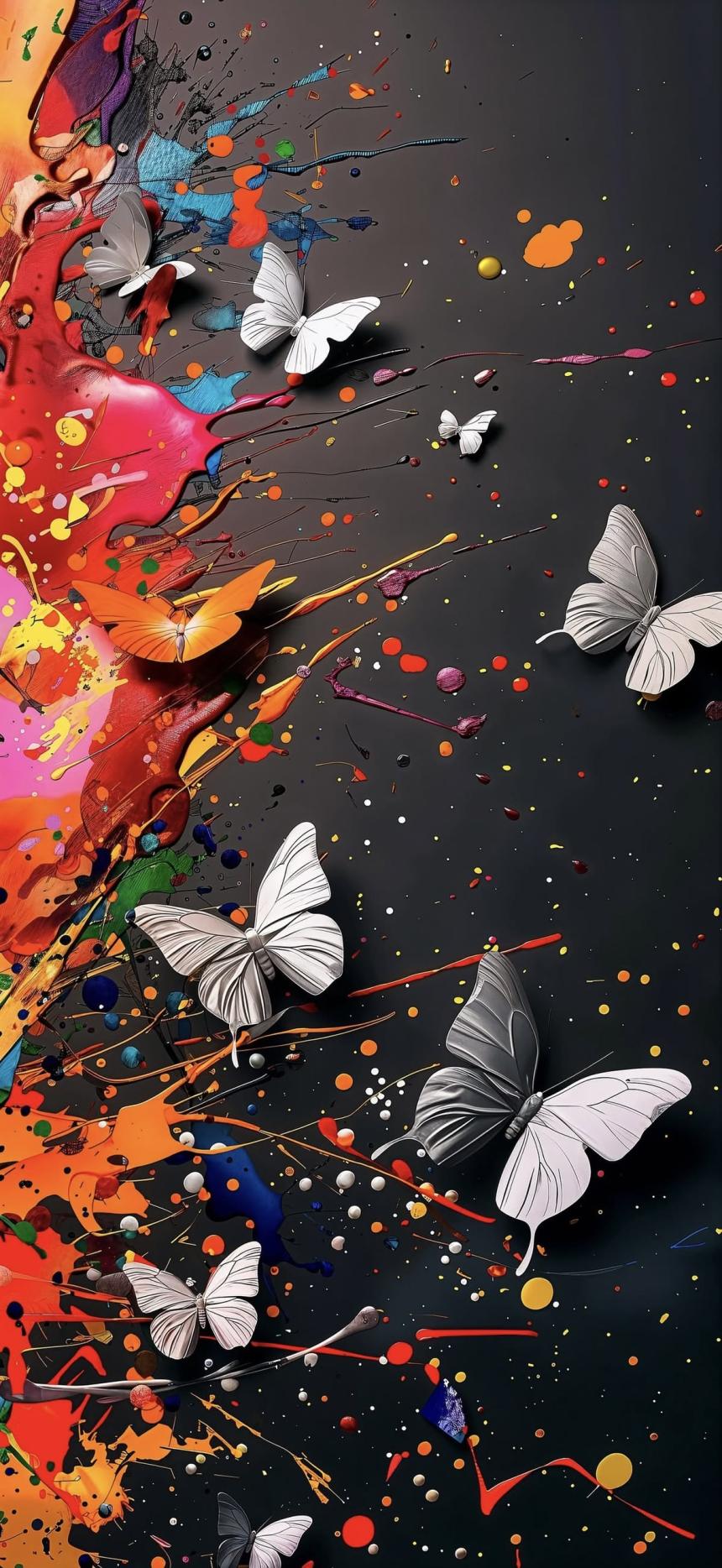 Bright butterflies with vivid paint splashes, dark contrast background, energetic abstract aesthetic wallpaper in HD.