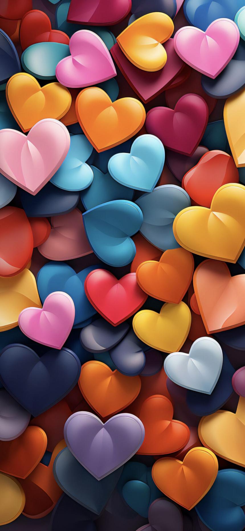 Glossy colorful hearts wallpaper featuring vibrant red pink blue and purple tones on dark aesthetic background in HD 4K.