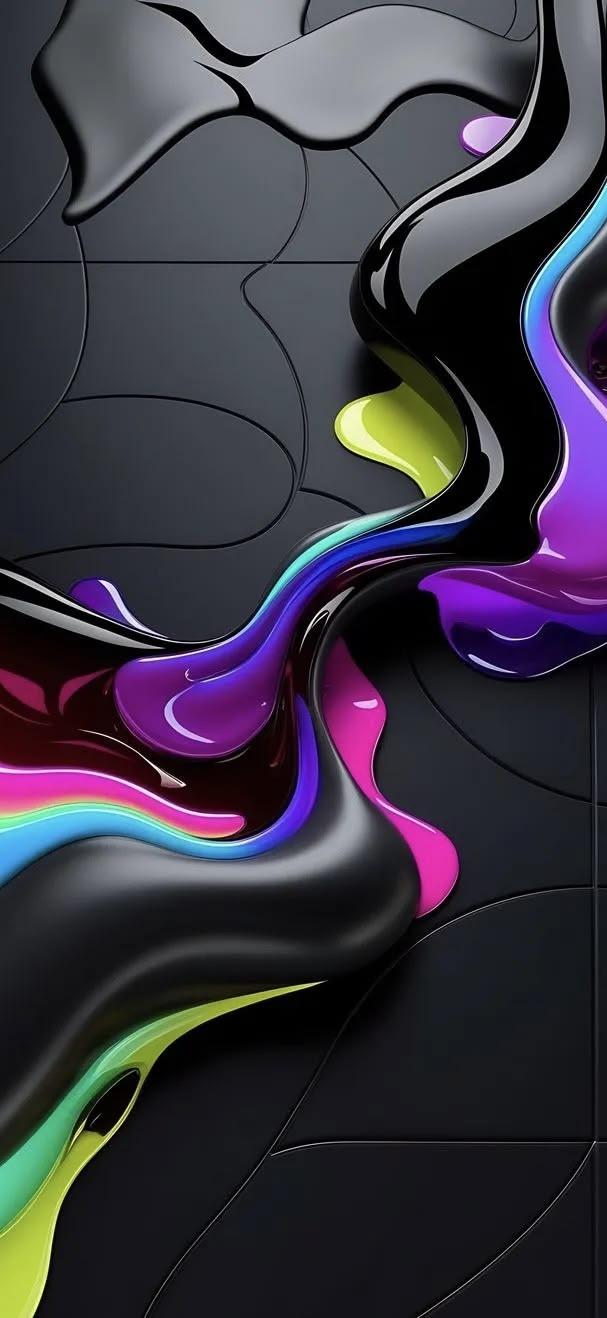 Vivid swirling liquid forms, glossy textures, dark contrast background, dynamic abstract aesthetic wallpaper in HD.