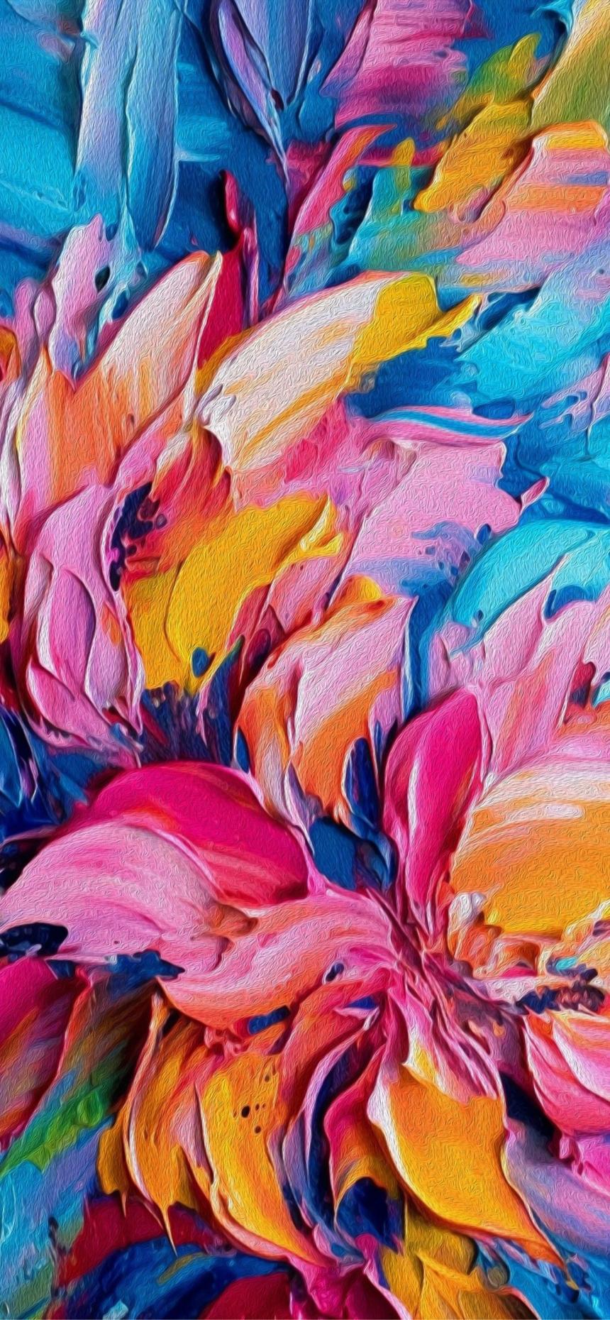Swirling pink orange yellow blue petals, thick oil paint texture, vibrant abstract aesthetic wallpaper HD