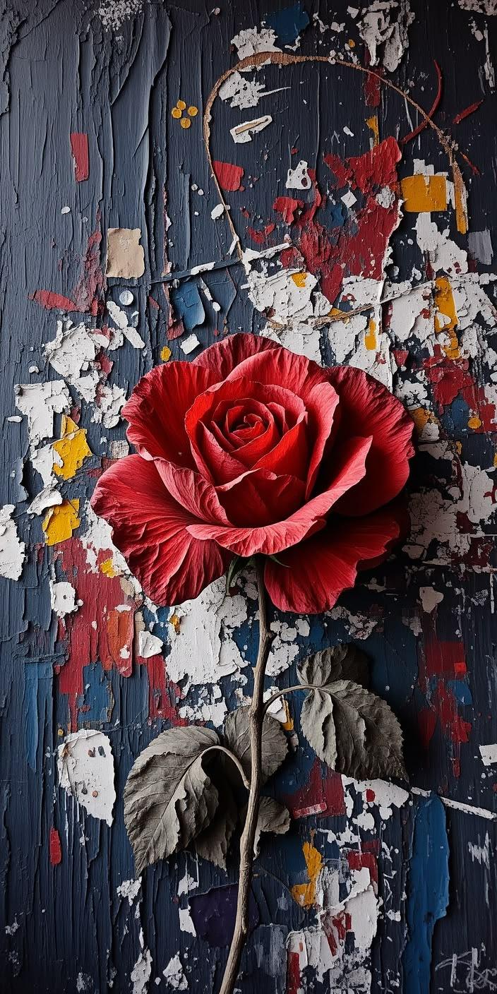 Red rose wallpaper with distressed blue background, artistic splashes, rustic vintage aesthetic style.