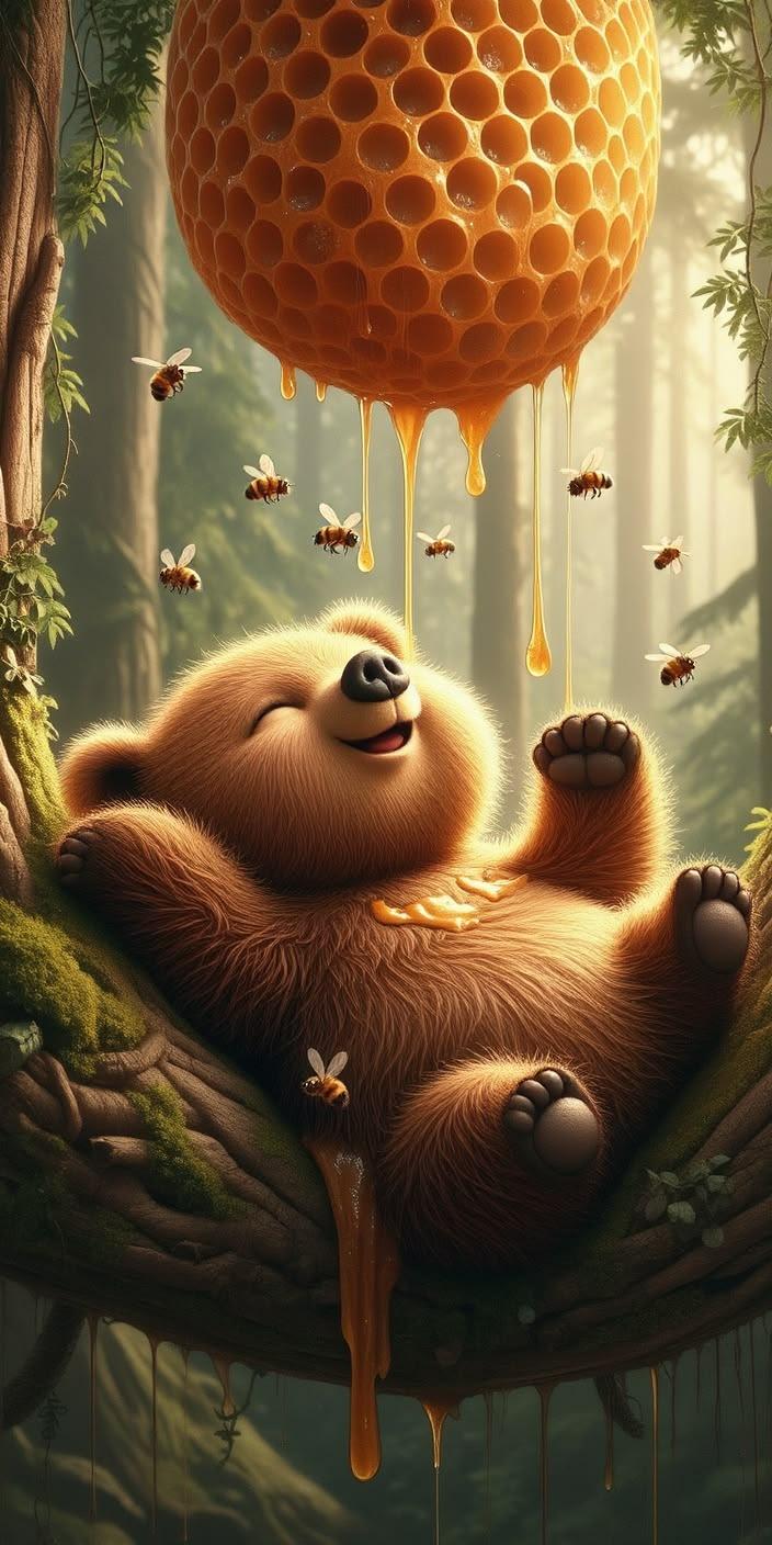 Joyful fluffy bear enjoying golden honey in lush forest, surrounded by bees and warm sunlight.