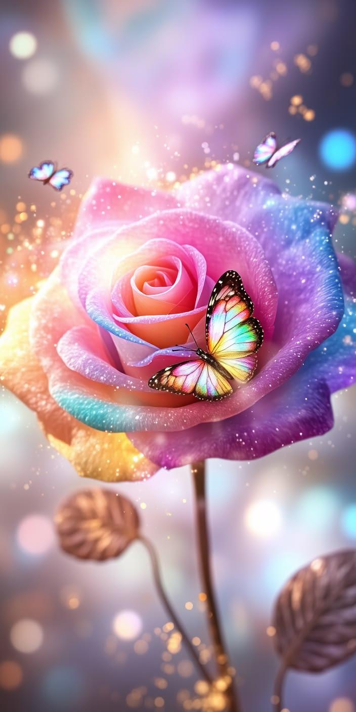 A dreamy fantasy illustration of a rainbow-colored rose with soft gradient petals in pink, blue, yellow, and purple tones, glowing softly.