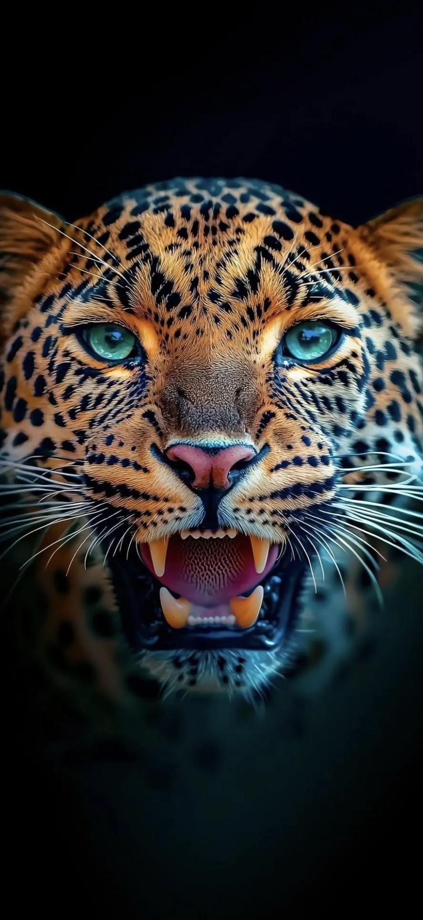 Intense leopard gaze, detailed fur pattern, sharp teeth, dark dramatic background, powerful wildlife aesthetic wallpaper HD.
