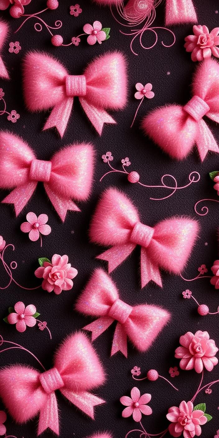 A vibrant 4K wallpaper featuring fluffy pink bows with glossy, shiny textures, paired with delicate pink flowers and elegant decorative swirls.
