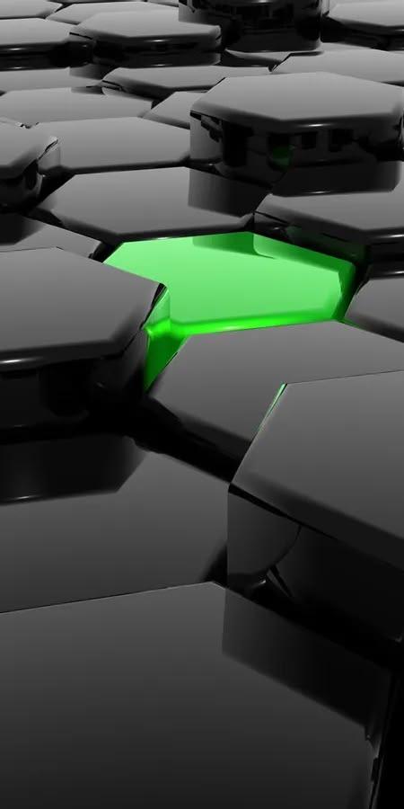 Dark geometric hexagon grid with single glowing green cell creates sleek futuristic tech aesthetic.