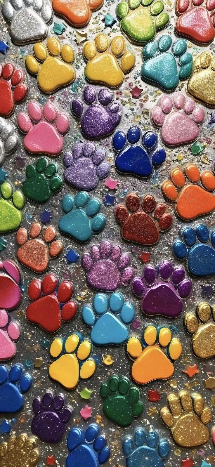Glossy 3D paw prints on shimmering silver background, playful, vibrant, cute animal aesthetic wallpaper in HD.