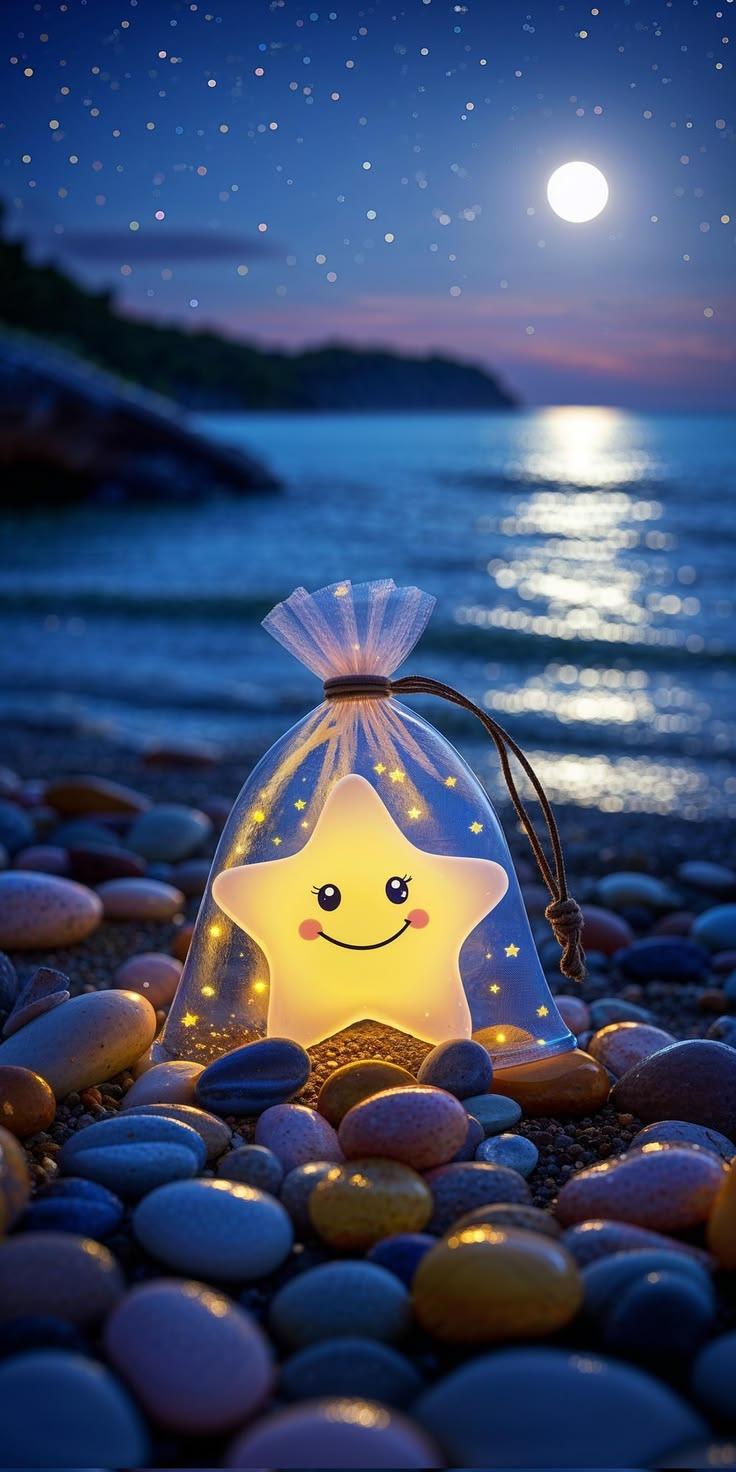 Star-shaped lantern wallpaper glowing on pebble beach under moonlit sky, serene magical night ocean background.