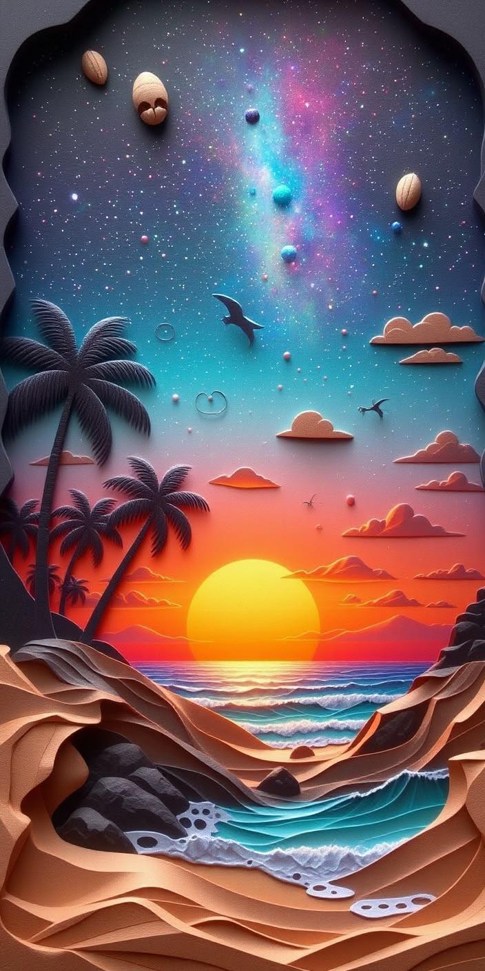 Layered sunset gradient with bold palm silhouettes, stylized clouds, and serene ocean beneath celestial sky.