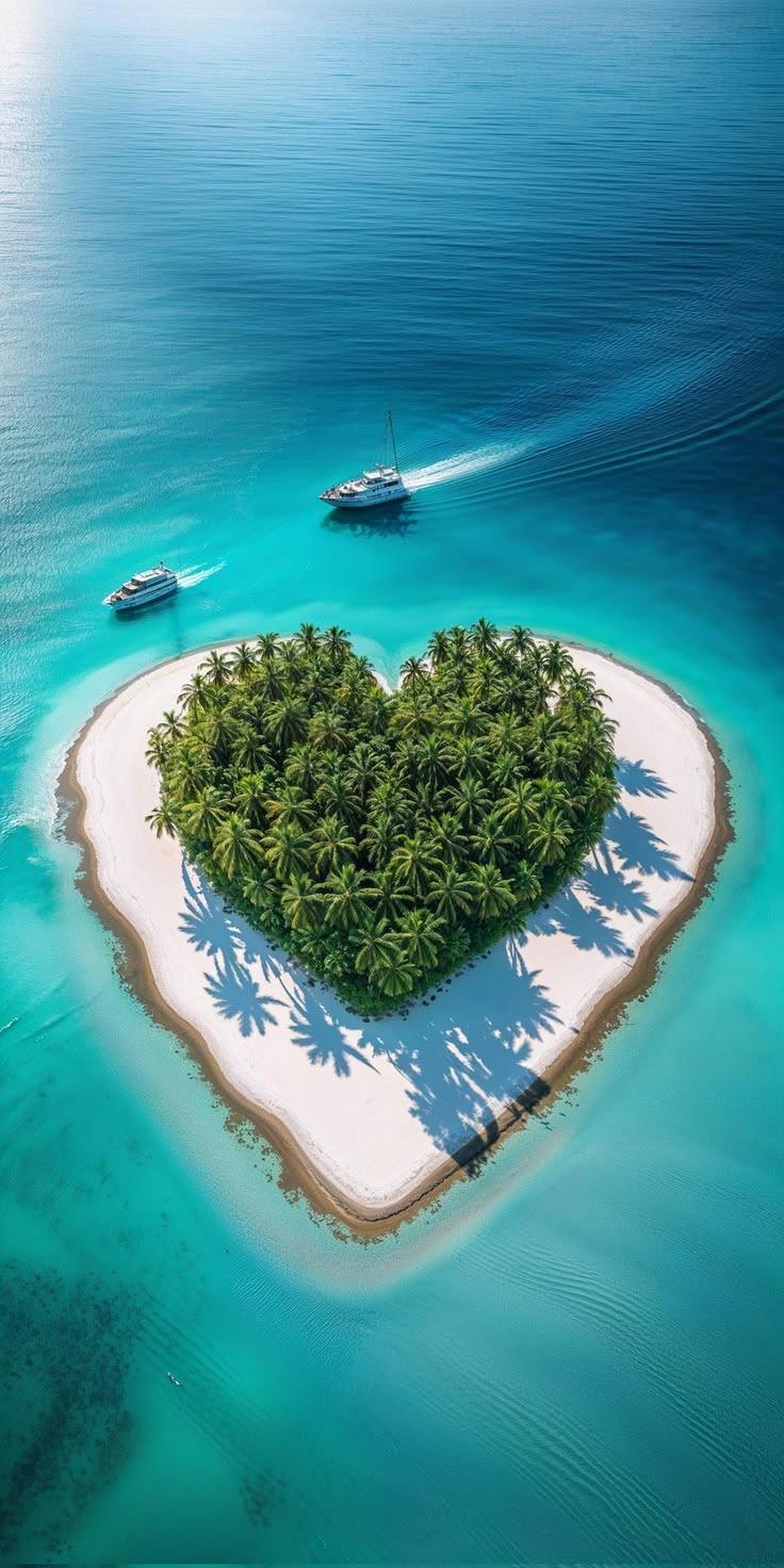 Aerial heart-shaped island wallpaper with white sand beach, palm trees, turquoise ocean water, tropical paradise aesthetic background.