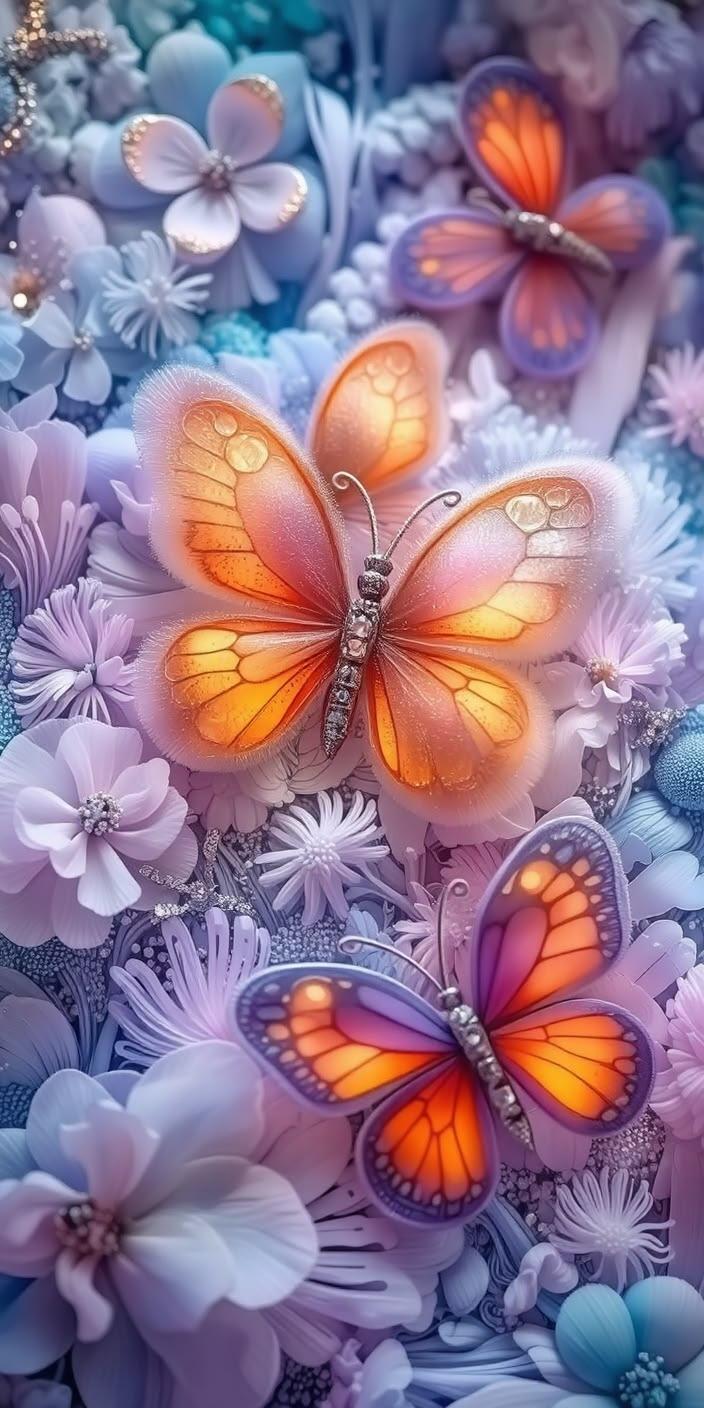 Colorful orange and purple butterflies flutter over pastel flowers, creating a dreamy, whimsical background with soft ethereal tones.