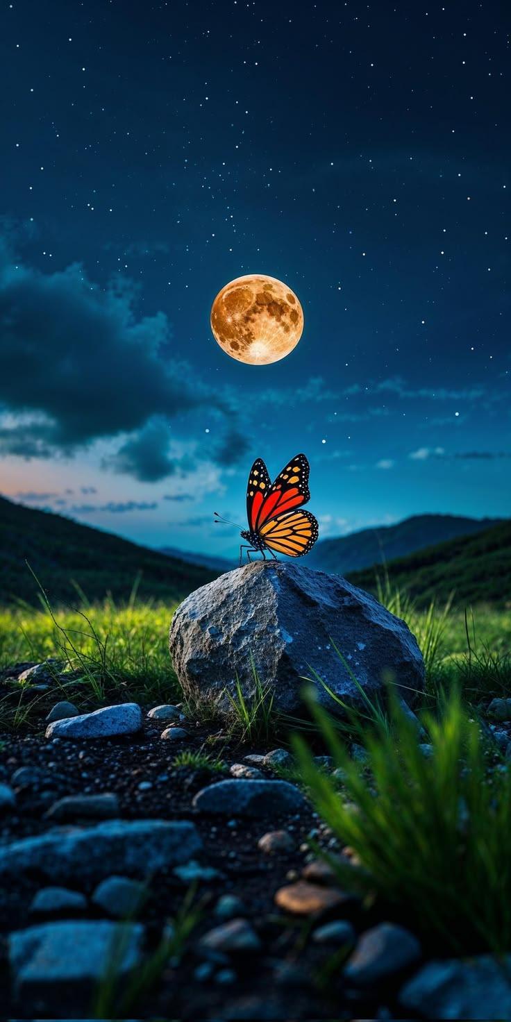 Stunning orange and black butterfly glowing under moonlight on rocky hills with starry twilight sky.