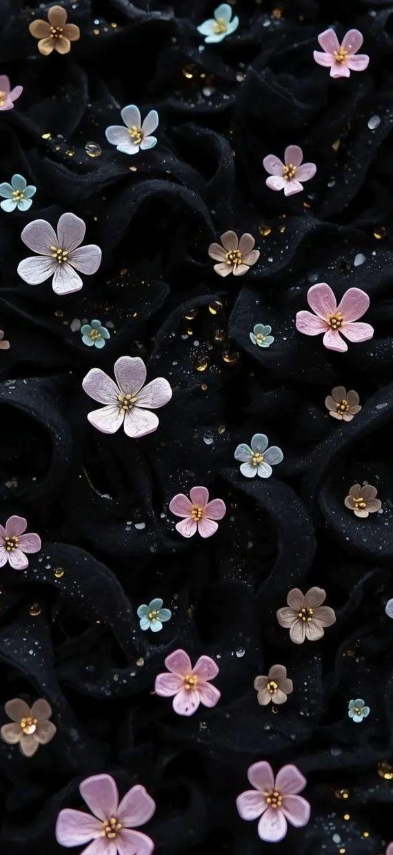 Soft pastel flowers on black wavy fabric, delicate water droplets, serene elegant aesthetic wallpaper in HD.