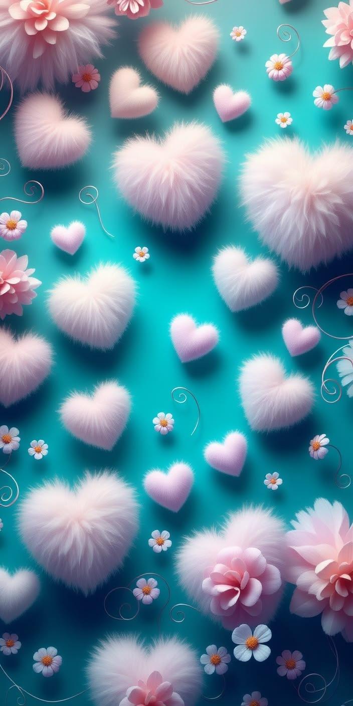 A playful and dreamy 4K wallpaper featuring soft pink hearts and delicate floral elements set against a vibrant teal background.