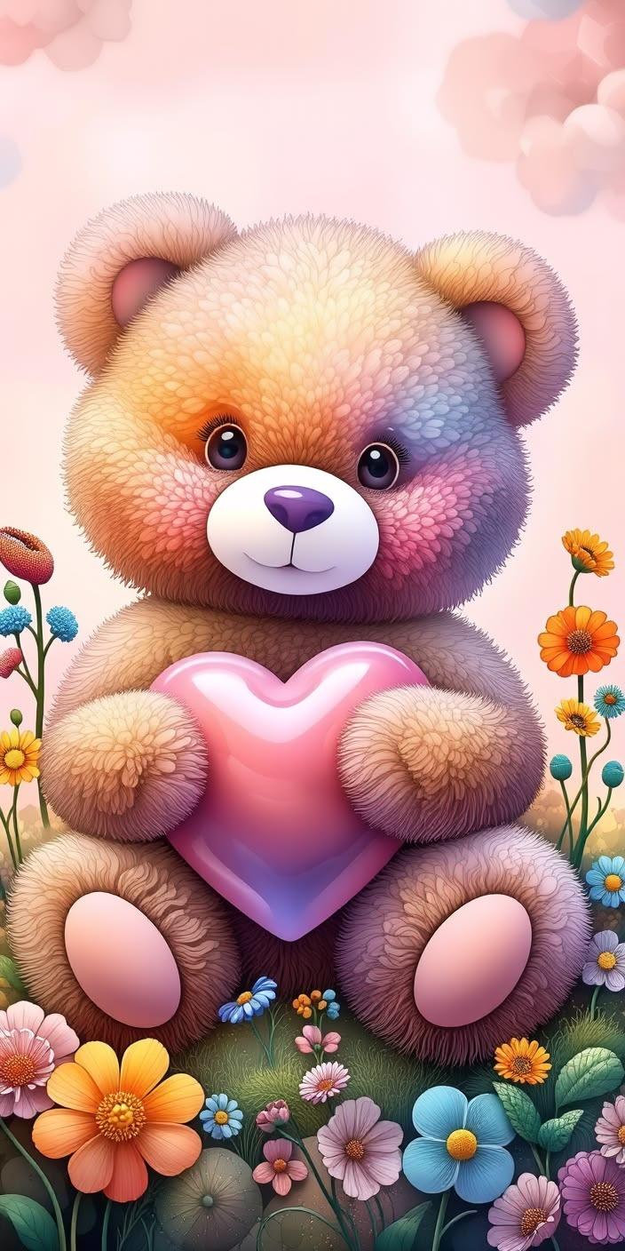 Cute pastel teddy bear holding pink heart sits among colorful flowers under whimsical pastel sky wallpaper.
