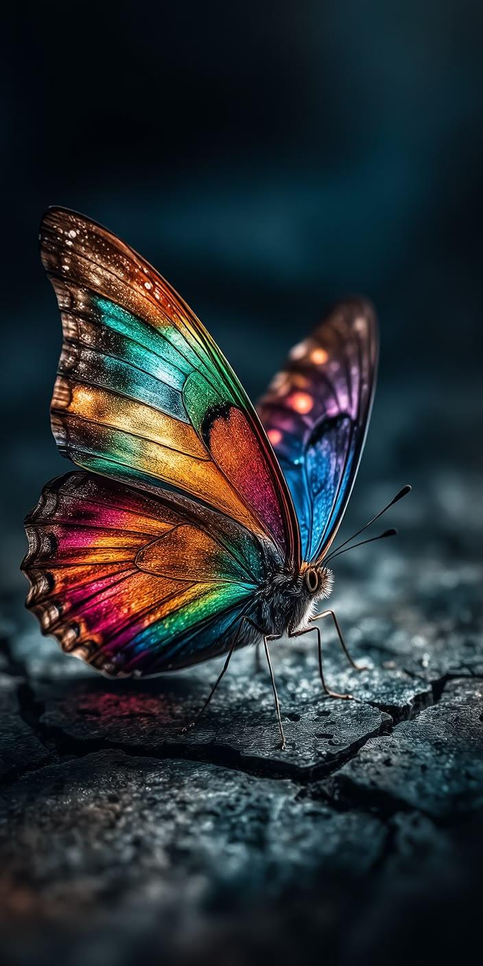 Vibrant rainbow butterfly with glowing wings on textured surface, colorful aesthetic wallpaper perfect for unique phone backgrounds.
