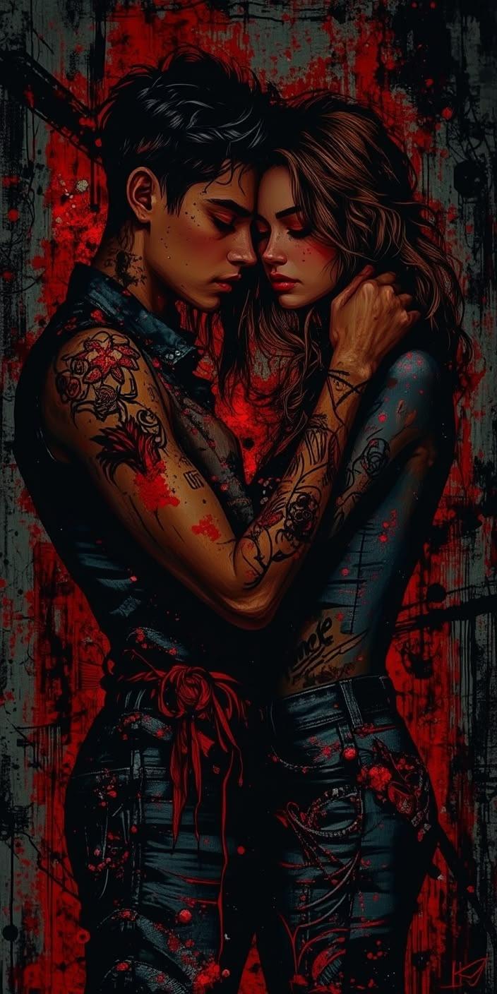 Dark romantic couple wallpaper with deep emotions, red abstract textures, cinematic lighting, aesthetic love scene, perfect for dramatic phone background.