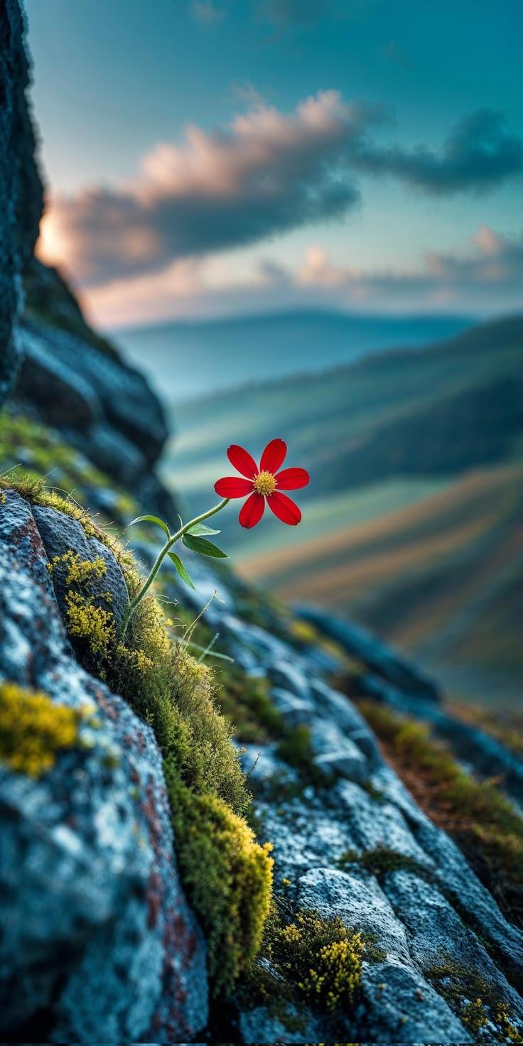 Vibrant red flower wallpaper against mossy rocks and soft pink-blue sky, serene mountain landscape background.