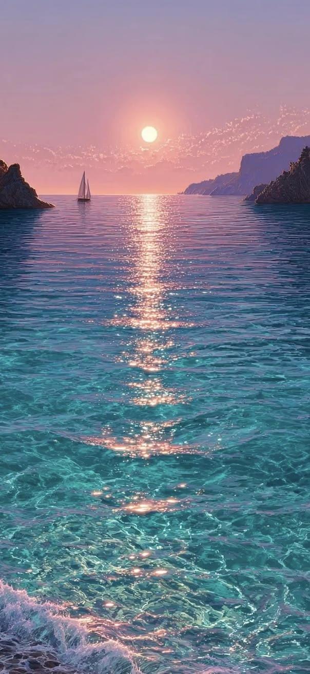 Vibrant sunset sky, pink orange reflections, turquoise water, sailboat between cliffs, serene ocean aesthetic wallpaper HD.