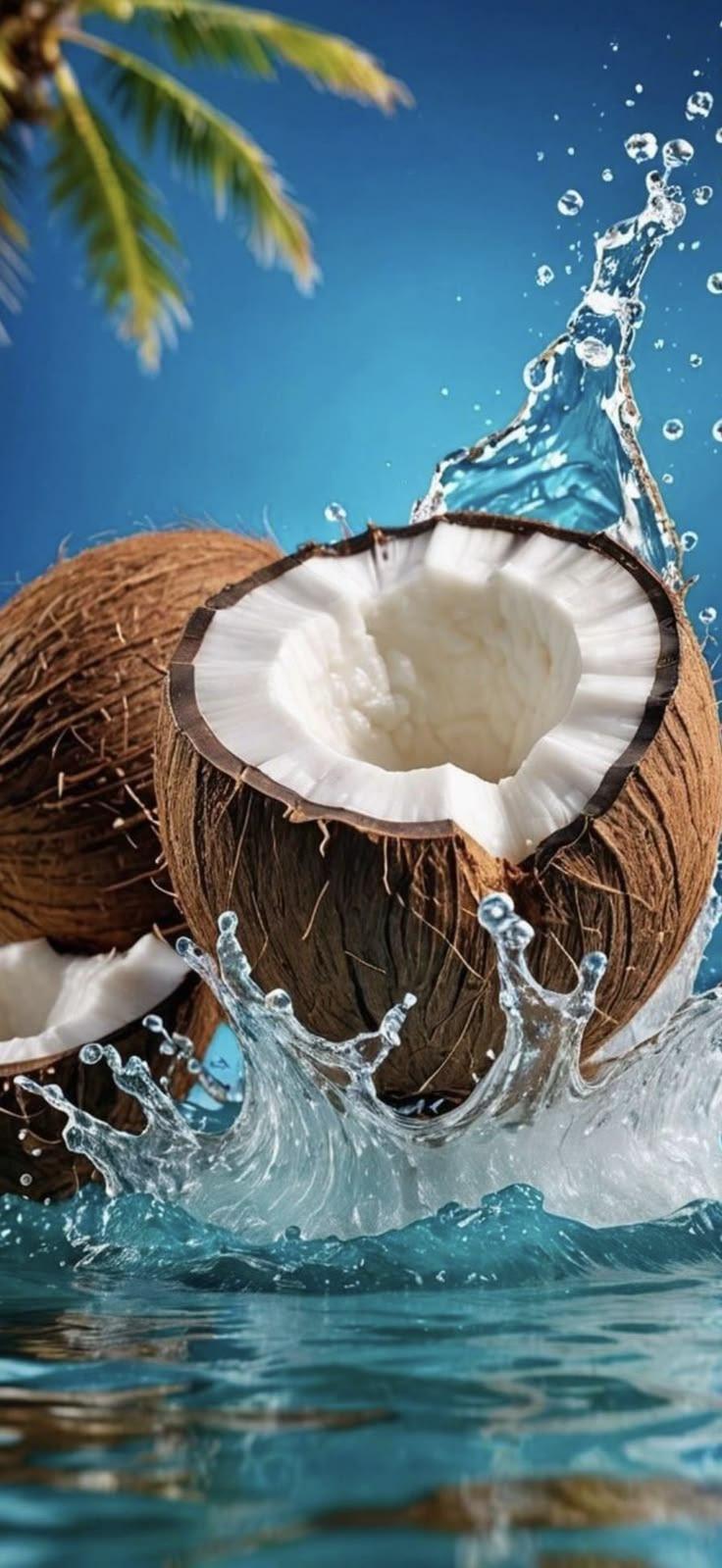 Fresh coconut splash, turquoise water, palm leaves, bright blue sky, vibrant tropical summer aesthetic wallpaper HD.