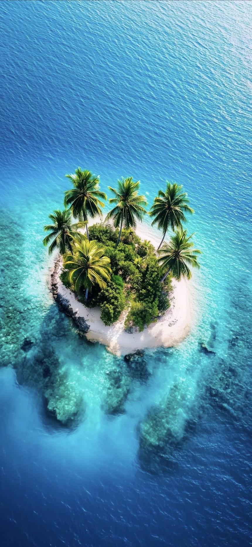 Lush green island, crystal blue ocean, coral reefs, sparkling sunlight, serene tropical paradise aesthetic wallpaper HD.