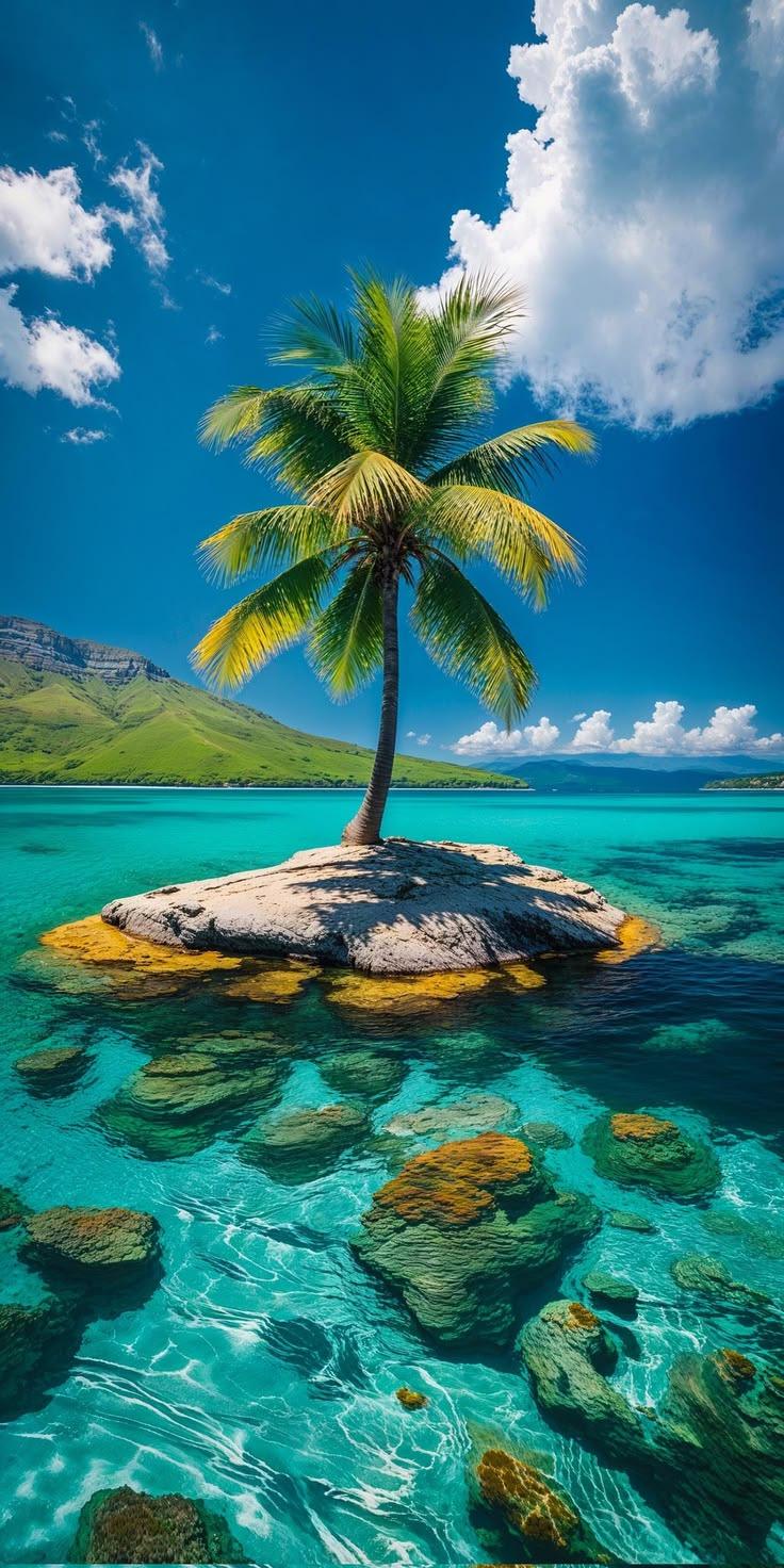 Serene tropical wallpaper featuring a lone palm tree on a rocky island surrounded by turquoise ocean, coral reefs, and bright blue sky.