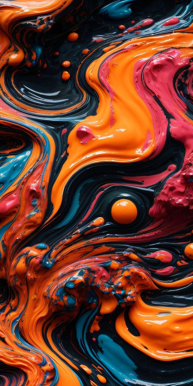 A dynamic abstract painting with vibrant orange, pink, and teal swirls against a deep black background.